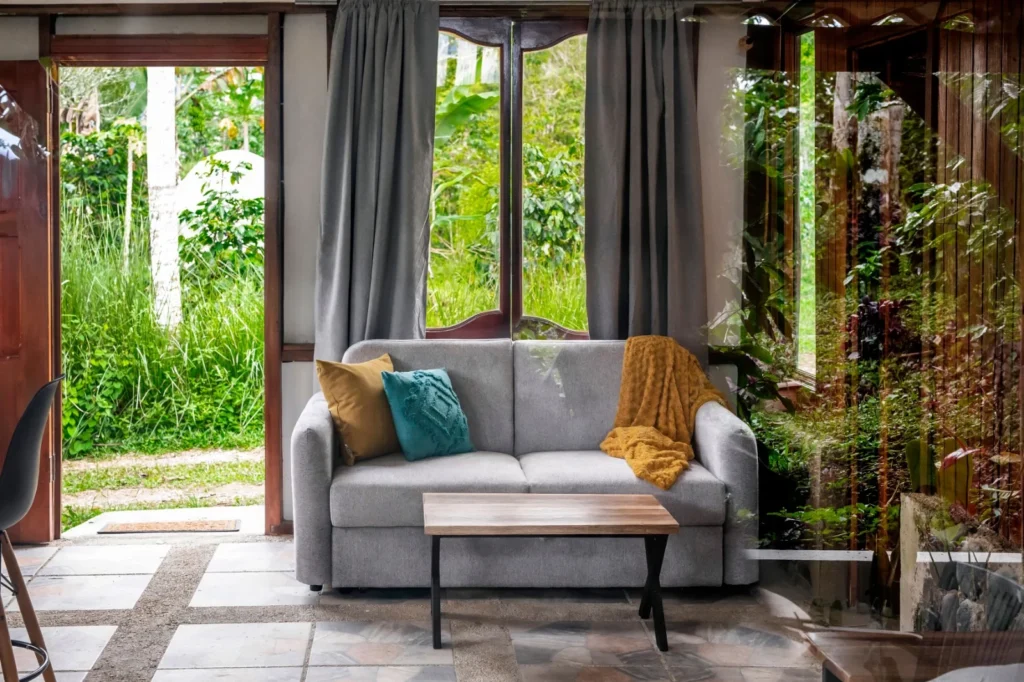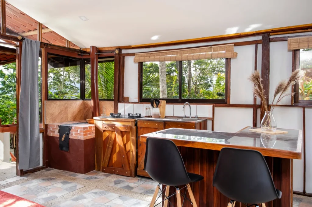 Rodeada de amplios ventanales, la cabaña ofrece una experiencia inmersiva, permitiendo contemplar en todo momento los paisajes verdes y la tranquilidad de la finca.