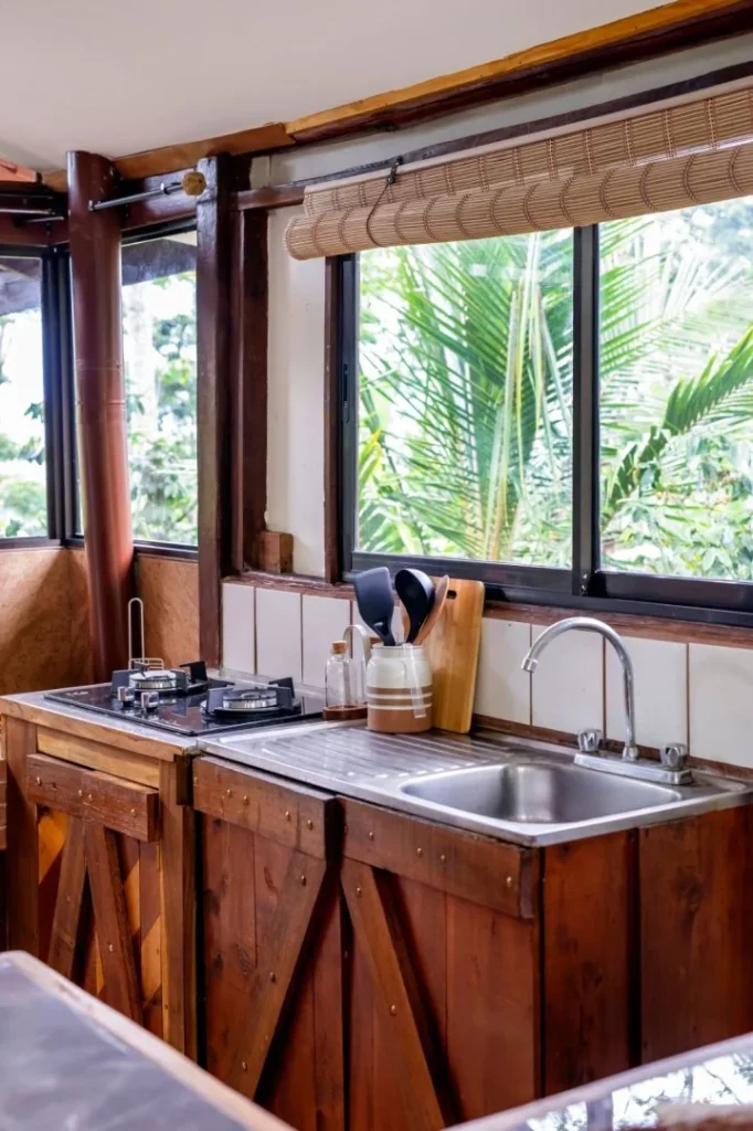 Casa Studio Cúrcuma es un alojamiento íntimo y acogedor, ideal para parejas o pequeñas familias que buscan privacidad en plena naturaleza. Dispone de una cama matrimonial y un sofá cama, con capacidad para hospedar hasta tres personas, así como una mesa de comedor y una cocina totalmente equipada para quienes desean preparar sus propios alimentos con comodidad.